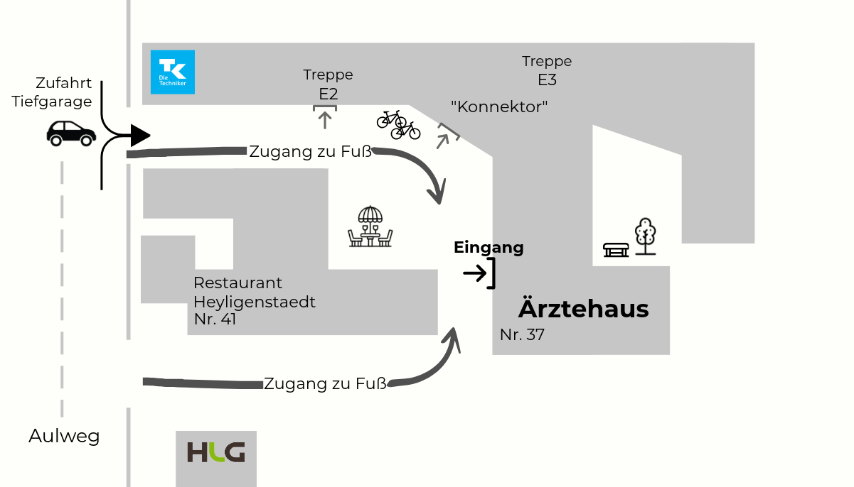 Sollten Sie einen barrierefreien Zugang benötigen, nehmen Sie das Treppenhaus „E3“ am hinteren Ende der Tiefgarage, dort befindet sich ein Aufzug.